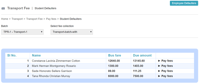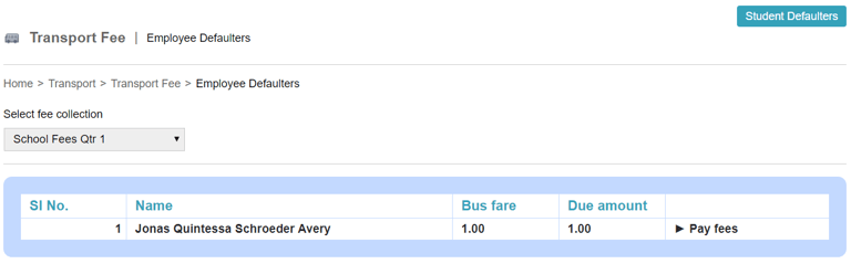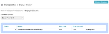 In order to find the employees who haven't paid the fees, click the module access icon > Administration > Transport > Transport Fee > Pay fees > Defaulters to open the Student Defaulters page.