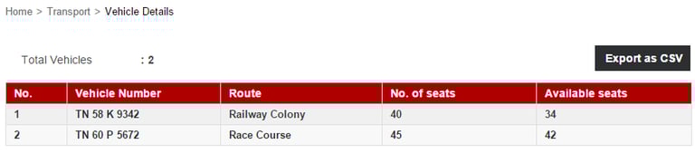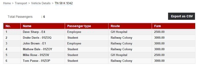 Each item in the table can be clicked to view additional vehicle details. For instance, if you click a vehicle number, all the names of students and employees assigned to the vehicle are displayed.