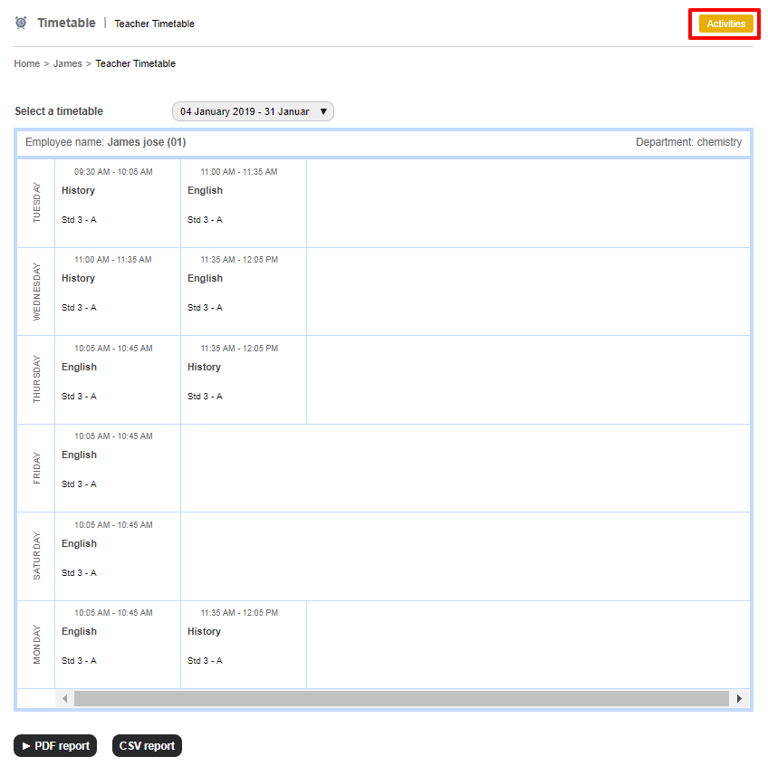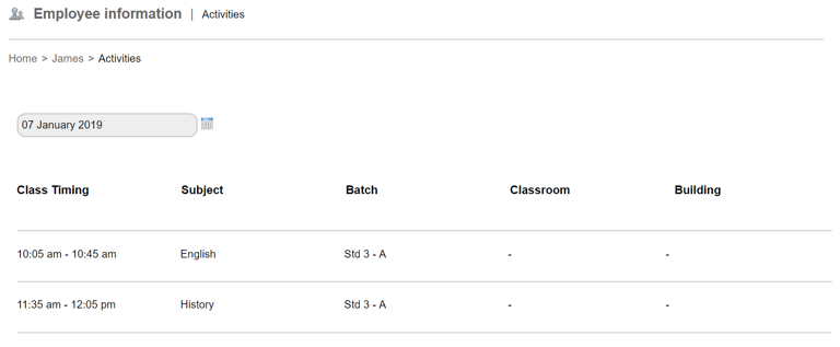 4. Click on the Activities button at the top right corner to view the timetable for a specific day or, can access it from Employee Profile > More > Activities.