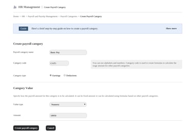 The payroll amount for a category can have numeric values or variable values based on formulas and conditions. For example, a payroll category ‘Basic’ can have the calculation rule as ‘40%GROSS’.