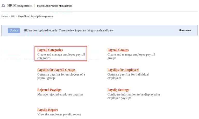 2. Click on Payroll Categories(first option in Fig 2) to open the Payroll Categories page.