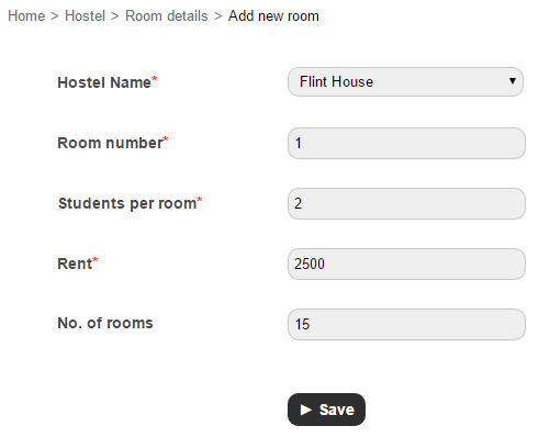 In the Room number field, enter the starting room number. Based on the total number of rooms in the hostel, the room number is automatically incremented.