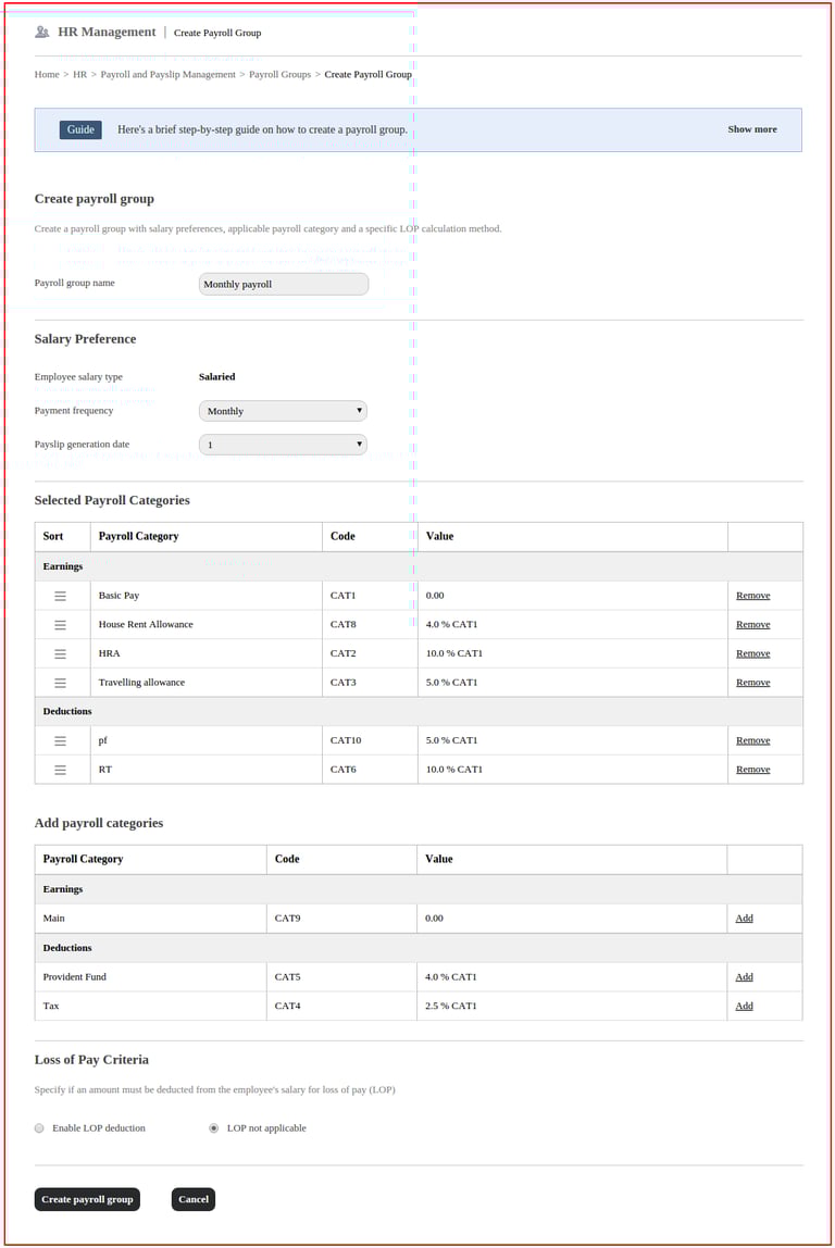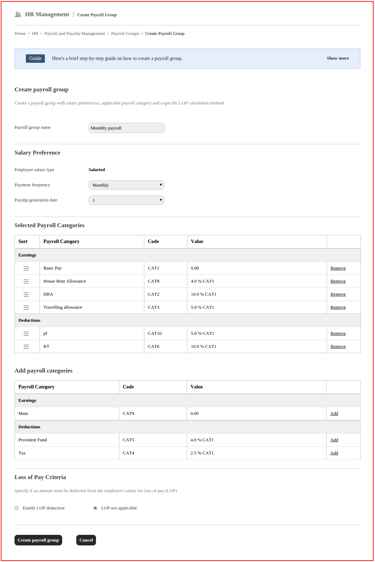 Note: When a payroll category is added, dependent categories are also added automatically. Similarly, when a category is removed, dependent categories are also removed.Specify if loss of pay criteria (LOP) must be enabled or disabled for the payroll group. If Enable LOP deduction from an employee’s salary is selected, you must also select the LOP calculation method from the following options: