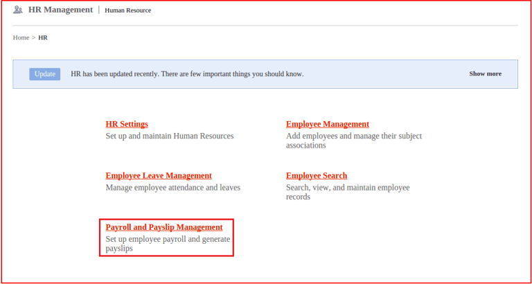 1. Click on module access icon > Administration > Human Resource > Payroll and Payslip Management as depicted in Fig 1.