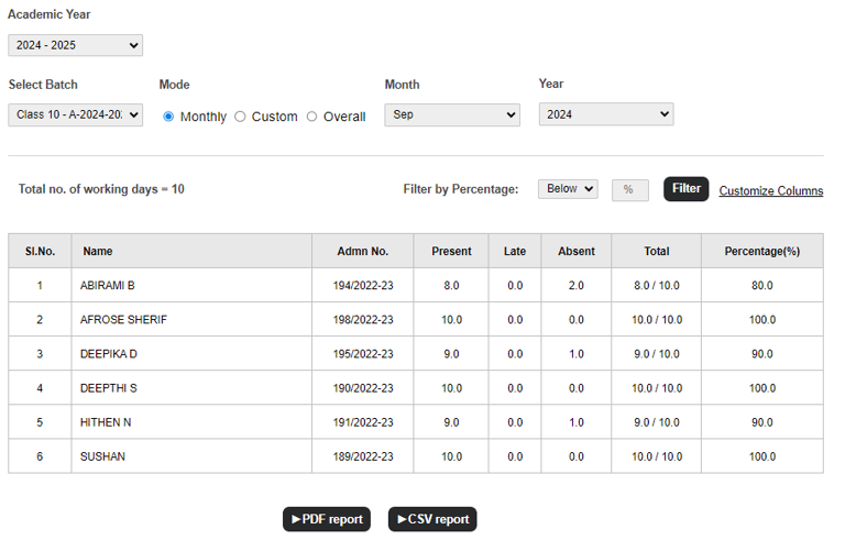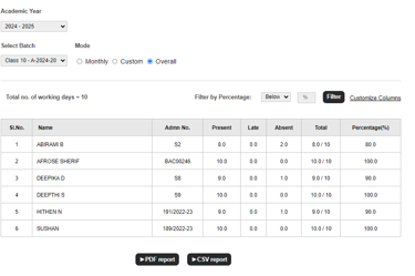 When generating the Student Attendance Report for a batch, for each subject you can generate the report for a month or for the complete duration of the batch.