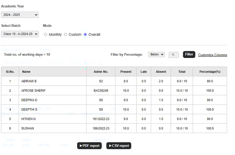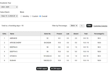 When you select the Overall option, the attendance count for all students over the entire duration of the batch will be displayed.
