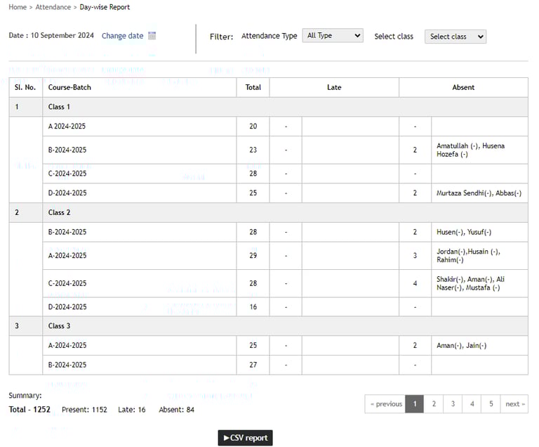To generate a CSV report of the number of students absent in each batch, click the CSV report button.