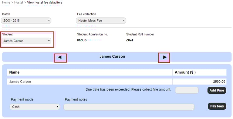 Process the fee payment for each student by selecting the students in the top left, or by using the arrow icons to navigate to the next student record.