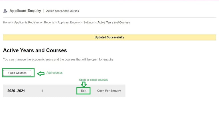 Menu >> Academics >> Applicants >> Enquiry >> Settings >> Active Years and Courses.