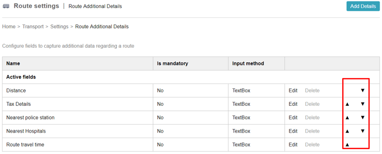 Use the arrow icons () to determine the order that the fields will appear whensetting vehicle routes.