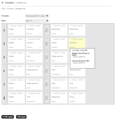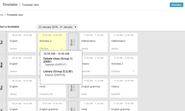 In Sharakshara, you can create a timetable that has more than one subject at same time period. You can also assign different students to these different subjects. For an instance, Let's assume that 'standard 3' students are divided into two groups and planning to conduct 'Library' for Group 1 and 'Debate class' for Group 2, then you can create a timetable as given below.