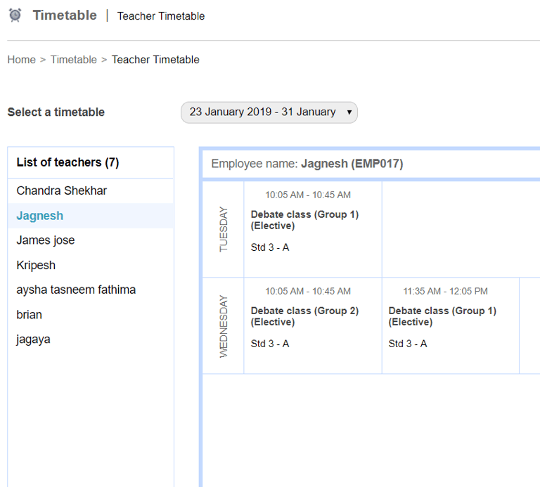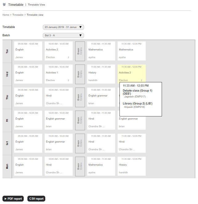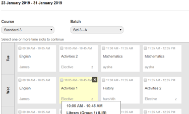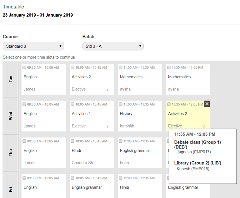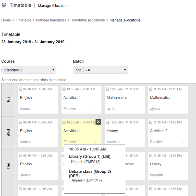 6. Create the time table, now you can select elective group into the required time period. This elective group will contain different subjects with different students. Make sure that you have done employee subject allocation before starting timetable creation.