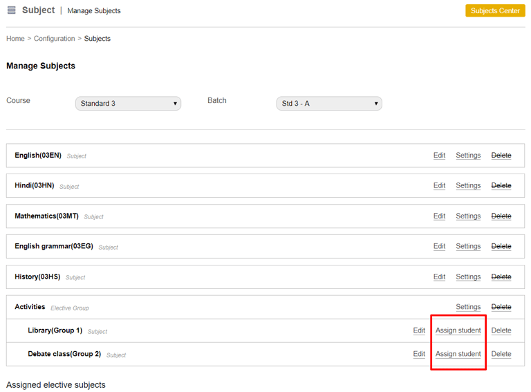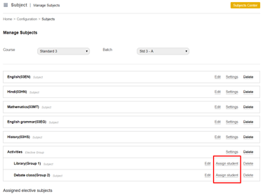 3. Assign the batch students as per the subjects you made by clicking the ‘assign student’ option on right side of the row. In next page you will get option to assign the students to current subject.