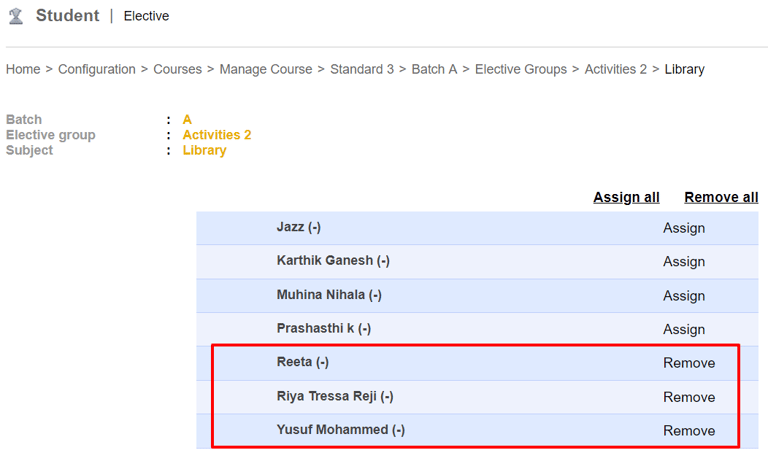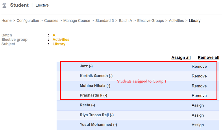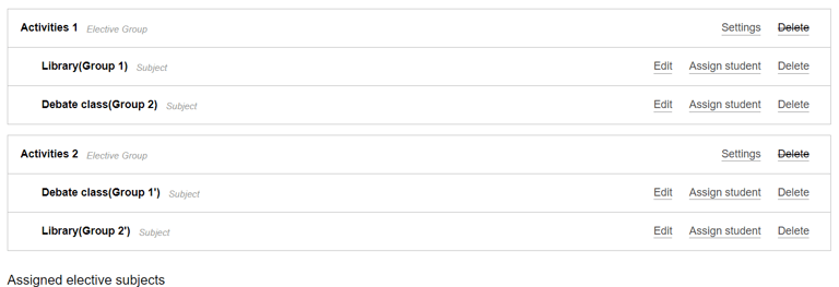 5. Add the subjects into the elective groups and then assign the students who were not assigned to this subject at the first time. In our case we will add Library (for Group 2') and Debate class (for Group 1').