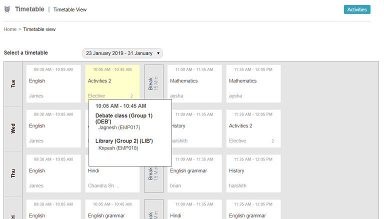 In the next period you can also conduct these classes by interchanging the groups. That is, 'Library' for Group 2 and 'Debate class' for Group 1.