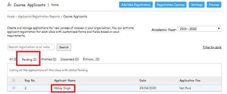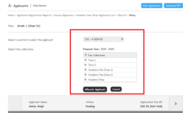 Note: Admin user can only allocate the admission to the Student if the application fee (if applicable) is paid already by online or offline in the institute.