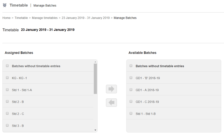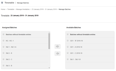 Select the batches you want to assign a timetable and use the arrow to move the selected batches from the Available Batches list to the Assigned Batches list.