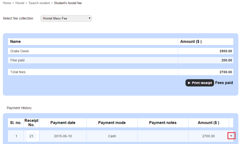 When collecting and processing hostel fees for each student, a full payment transaction must be created. You cannot create a partial fee payment transaction.