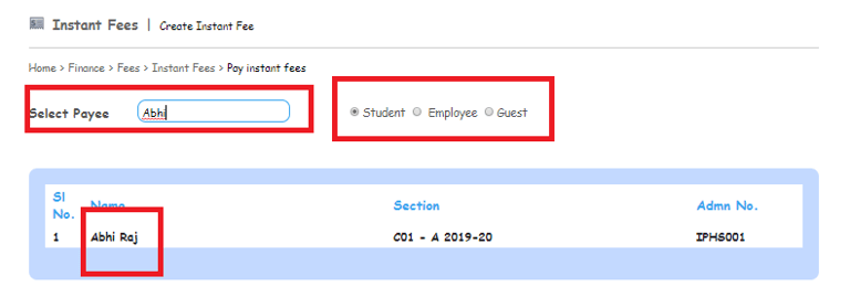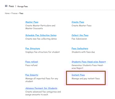 To collect an instant fee, the Admin/Privilege user needs to perform the below steps: