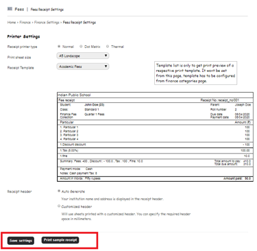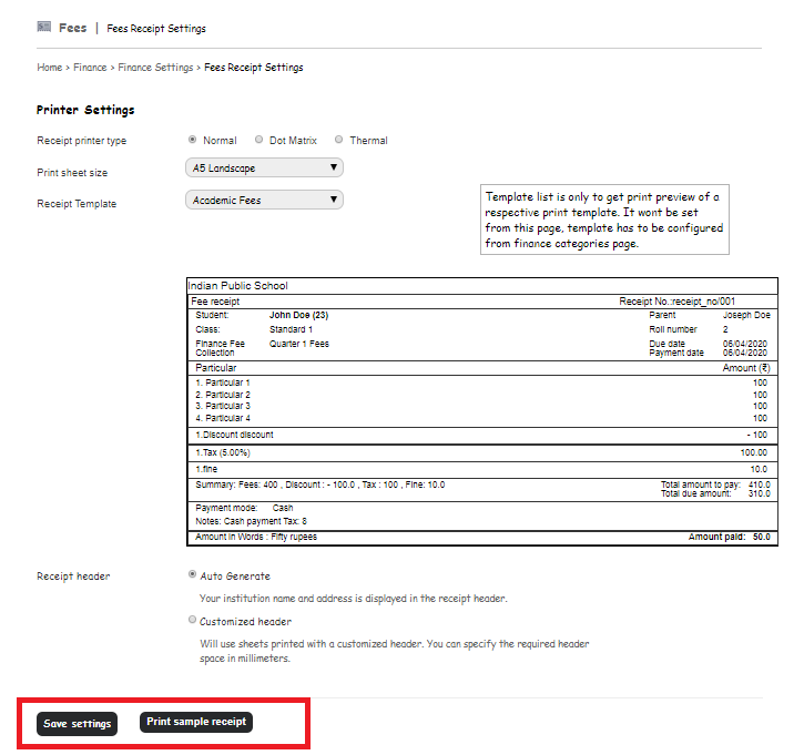 Receipt header: Select the receipt header as Auto-Generated (Using this, the institution name and address are displayed in the receipt header) or Customized header (Using this, the customized header can be given in case the institute is having the printer sheet having the header already). The Admin user needs to specify the required header space in millimeters.