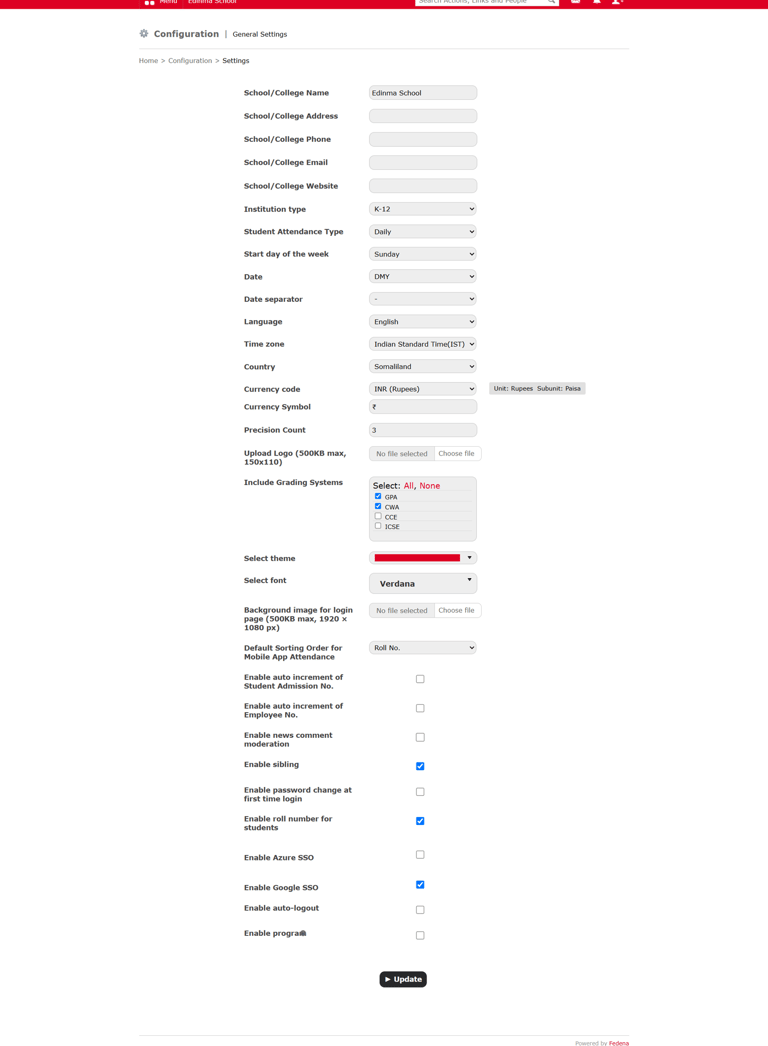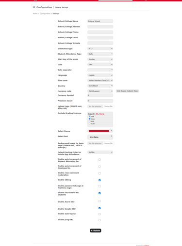 General settings is available in the Setting modules. We can make the basic configuration of the institution from the General settings as shown in the figure below. The number of fields on the General settings page may vary depending on the number of plugins made available to your institution.