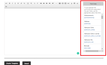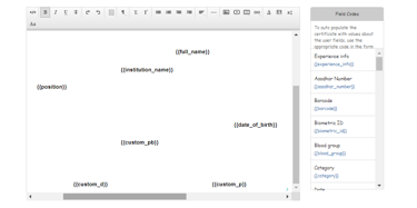Enter the certificate content by adding the field codes in the text editor area.