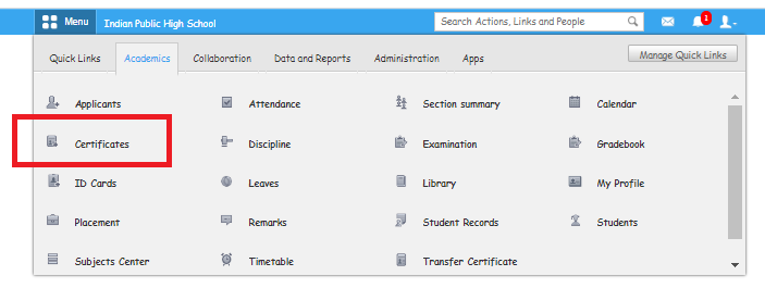 Step 1: Goto Menu > Academics > Certificates
