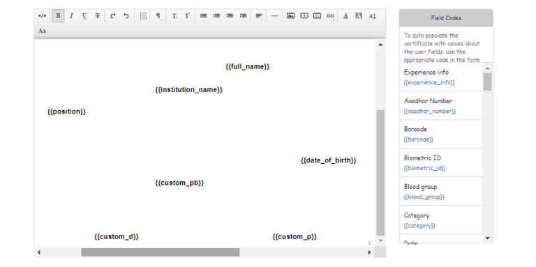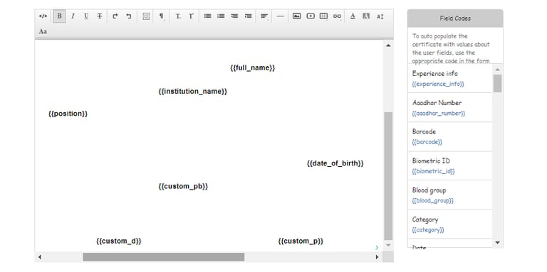 The field codes helps here to fetch the desired value which is present in the system with respect to the selected user while generating the certificate.