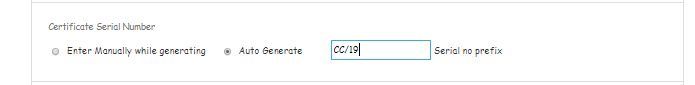 If the user selects Auto generate option, then the certificate number will get generated automatically by auto incrementing the serial number ‘1’ with the prefix which is entered in the serial no prefix text box.