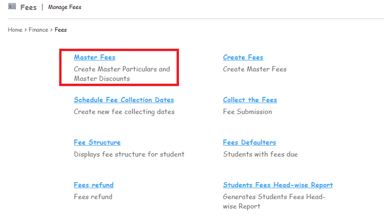 Using this option, an admin or the privileged employee can create the “Master Particular and Master Discounts”. This master particular name can be used while creating fees. Later you can check particular wise transaction reports from the finance section