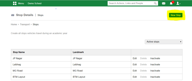 At the top of your dashboard, click the module access Menu > Administration > Transport > Stops to open the Stop Details page.