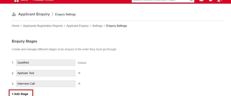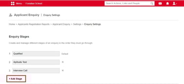 To do so go to Menu >> Academics >> Applicants >> Enquiry >> Settings >> Enquiry Settings >> Add Stage.