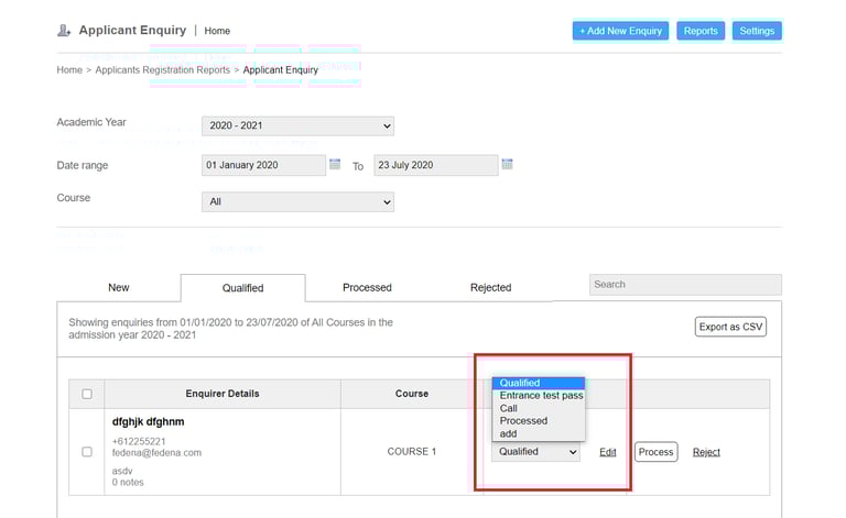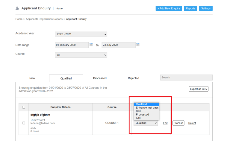 By default in Fedena there are 3 stages in Enquiry Module namely - Qualified, Processed, and Rejected. Apart from these three, you can add various custom stages within the Qualified stage as per your institution's requirement.