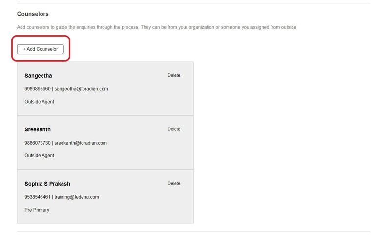 We can add either the employees admitted in Fedena or outside agents as counselors for the enquiry module.