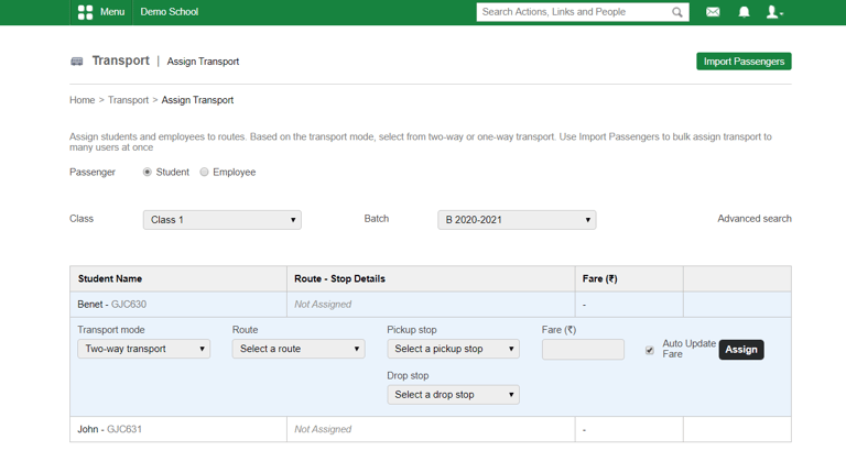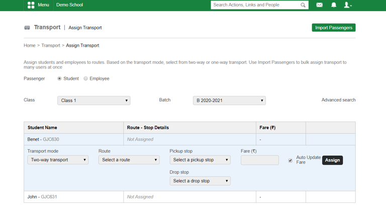If passengers are using same route for pick up and drop you can enable this option. So while assigning transport, you will get the page like below,