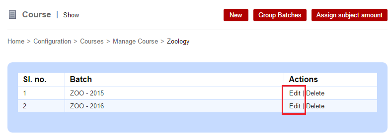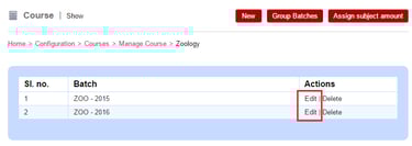 The administrator or a privileged employee (Manage Course/Batch privilege must be provided) can edit a batch through the Manage Course page or the Manage Batch page.