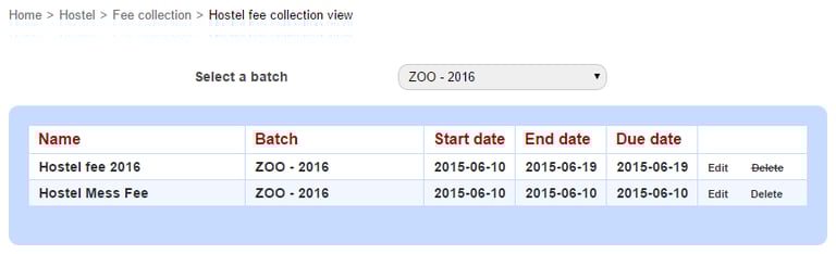 Click Edit to edit the fee collection dates, or click Delete to delete a fee collection.