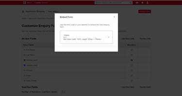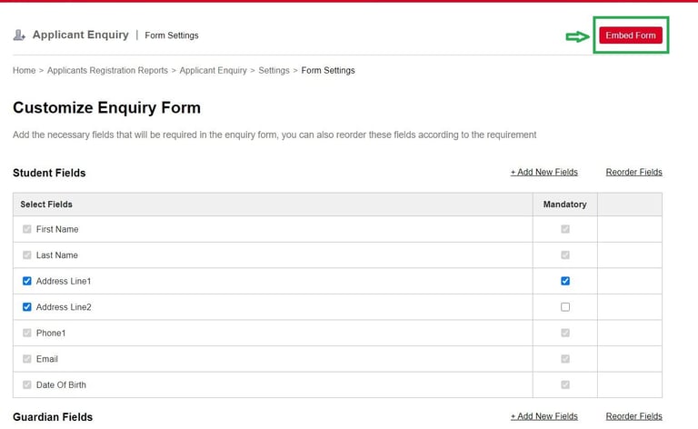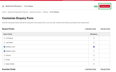 Menu >> Academics >> Applicants >> Enquiry >> Settings >> Form settings >> Embed Form