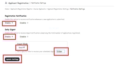 As per the institute requirement, the Admin user can configure the notifications settings for the applicant registration module to get the notifications for any new application or to know the daily digest.