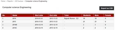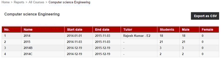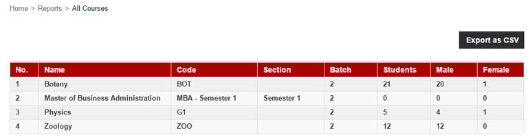 The Course/Batch Details report lists all active courses together with the number of batches and the number of students in each course.