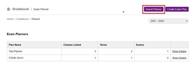 Menu >> Academics >> Gradebook >> Exam Planner >> Import Planner