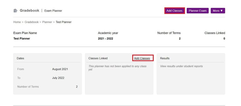 Once the planner is generated and exams are created for the term, the next step is to link the classes which follows the exam pattern to the planner.