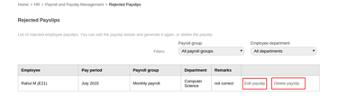 Once the employee is selected, you can either edit the payslip and generate the payslip again or delete the payslip for the employee.