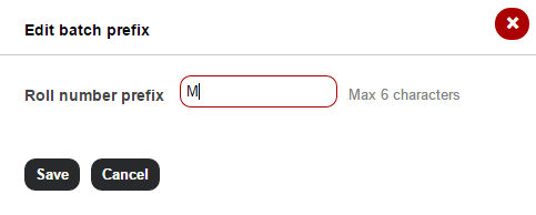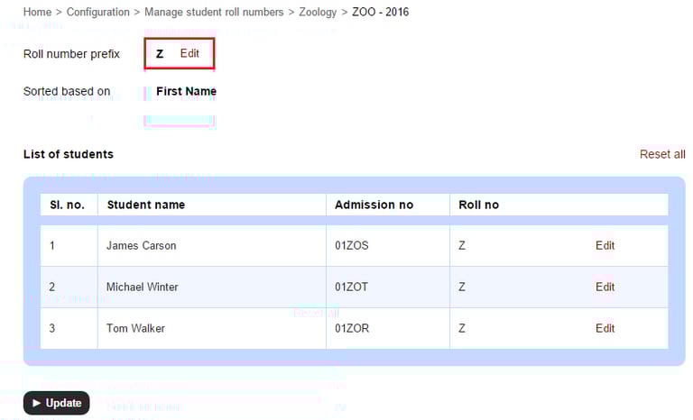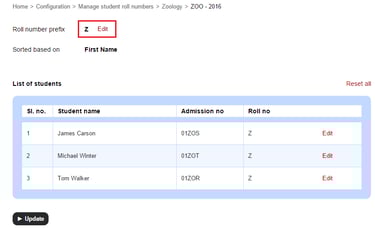 Change the roll number prefix, and then click the Save button. The roll number prefix is updated for all students.