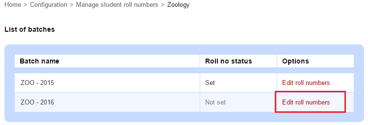 At the top of your dashboard, click the module access icon > Administration > Settings > Manage student roll numbers to open the Manage roll number page.