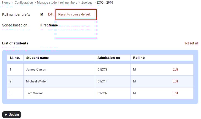 You can always reset the roll number prefix of the batch to the default course roll number prefix by clicking Reset to course default.