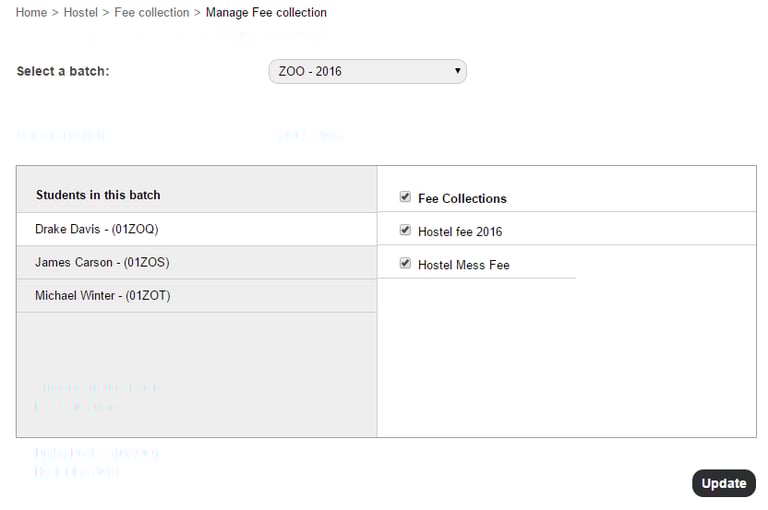 Select a batch. All students and their corresponding hostel fee collections are listed. You can then unassign the required fee collection(s).