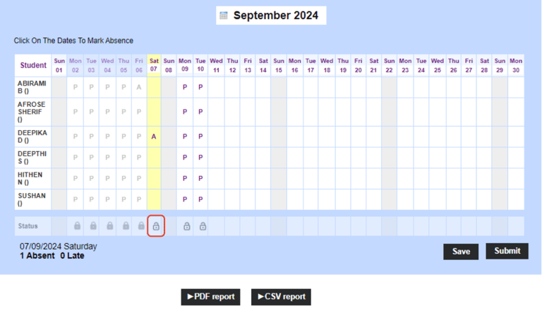 After saving and submitting the attendance for a date, if users want to mark/edit/delete the attendance for the same date follow the below steps.