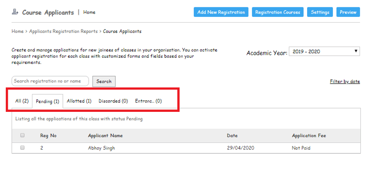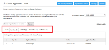 Once the application is moved into different statuses, the Admin user can see those applications in their respective status tab.