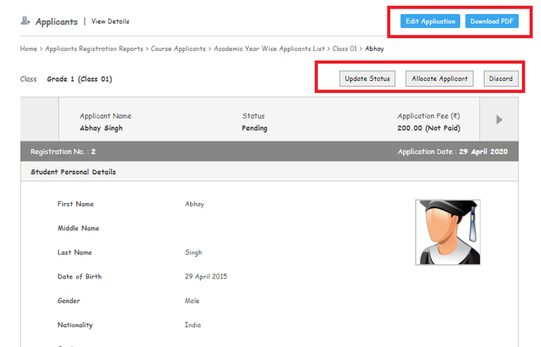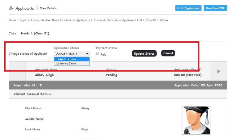 At this status, the Admin user can change the status of the application into an additional status which is created as per the requirement which can be used as a filter based on such status. For Eg: Entrance Test Conducted, Interview Conducted, On Hold, etc.